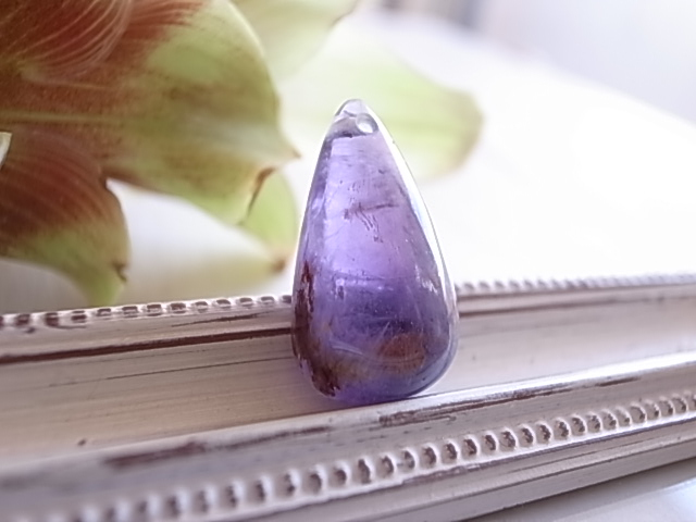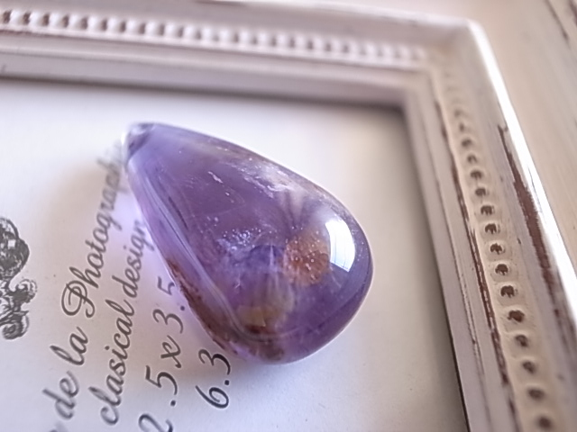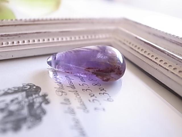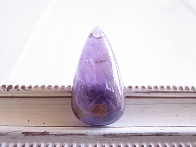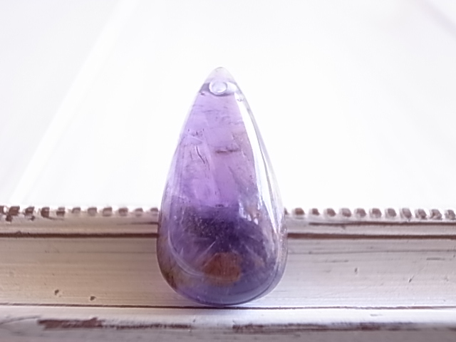 紫色のアメジストと内包物が織りなすコントラストは自然の鉱物ならでは。こちらは穴あきですので、アクセサリー制作に向いていますね。