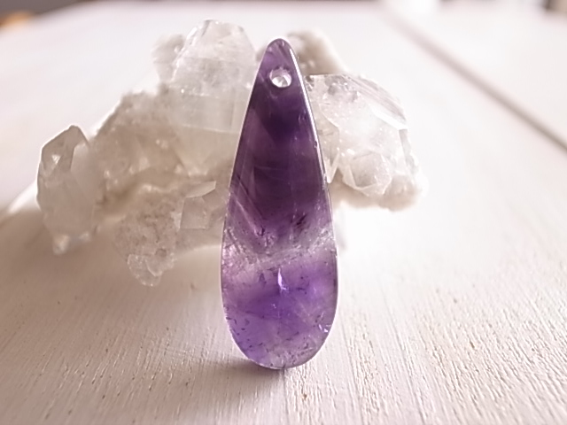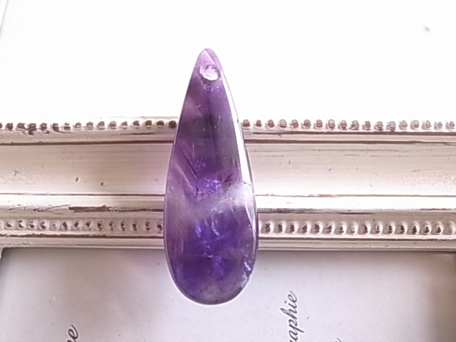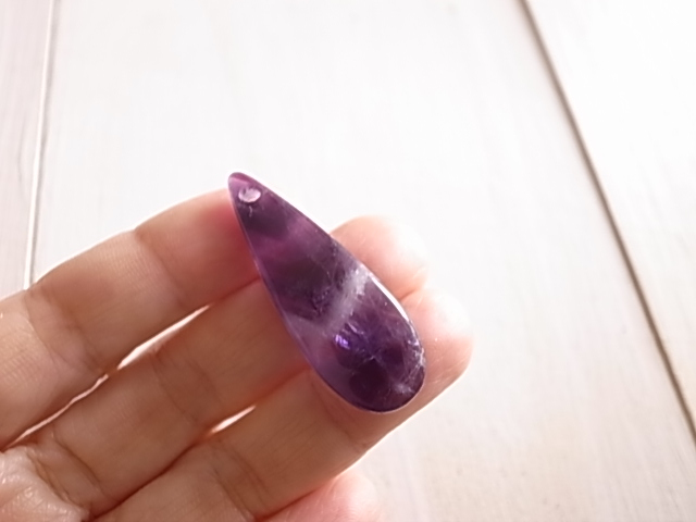 山形の縞模様が魅力的なシェブロンアメジストです。こちらは穴開きですので、アクセサリー製作にいかがでしょうか。