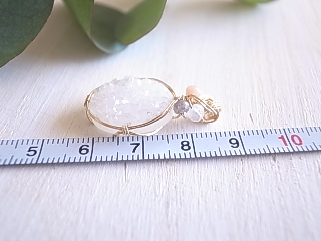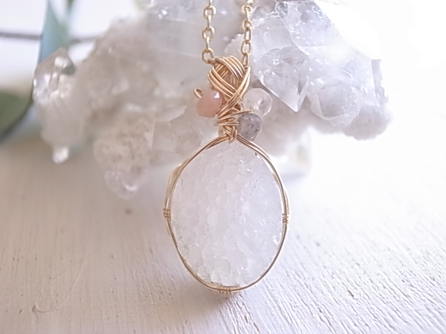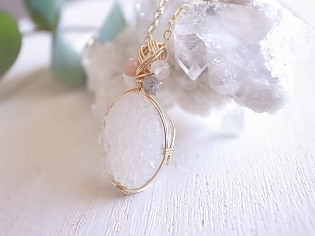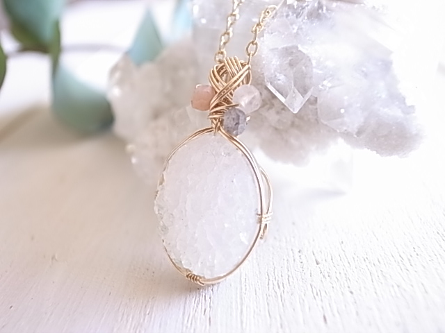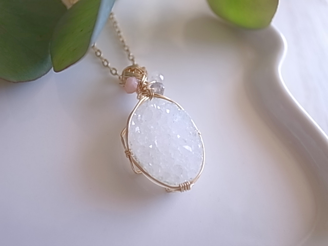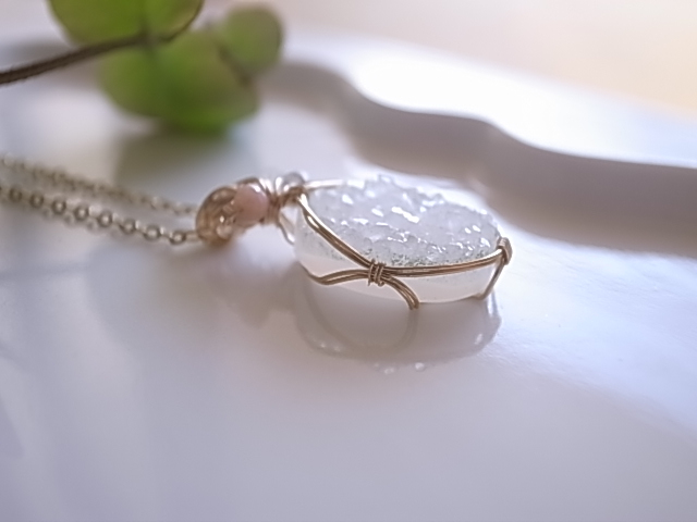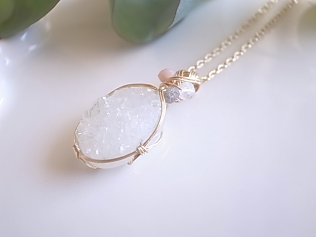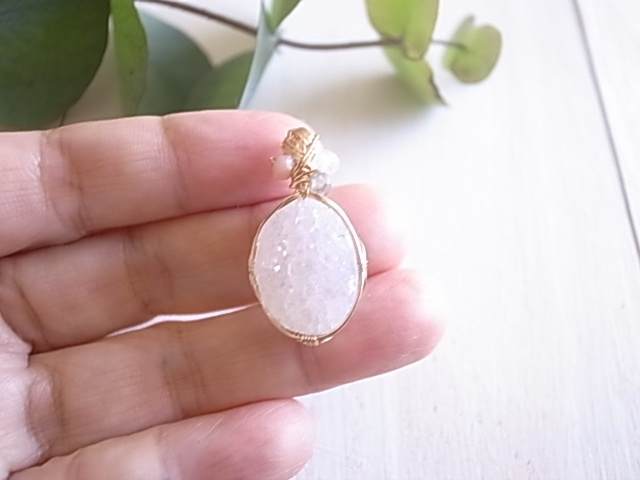 光が当たる度、キラキラと繊細に輝くドゥルージーアゲートのペンダントトップです。飾りにピンクオパール、ムーンストーン、ラブラドライトの粒が付いています。