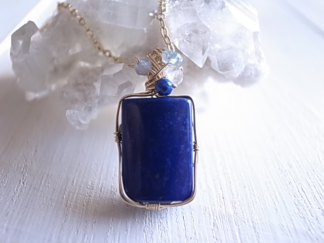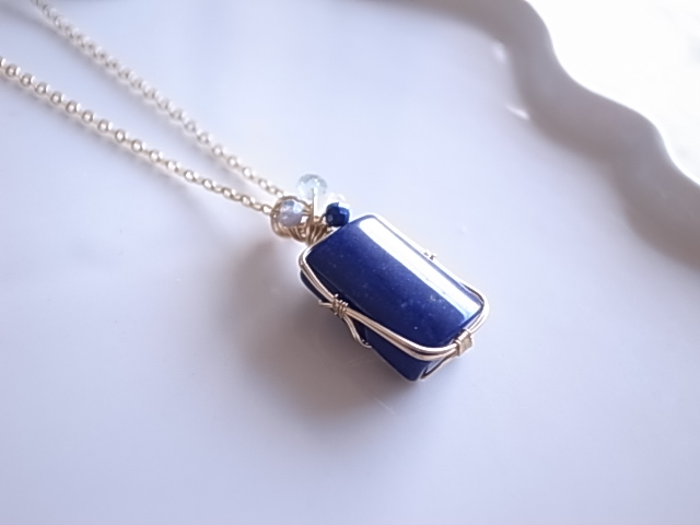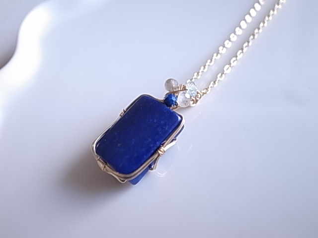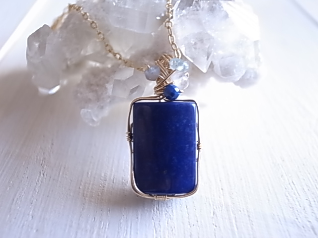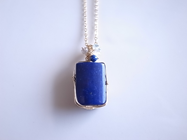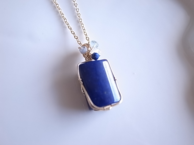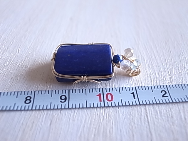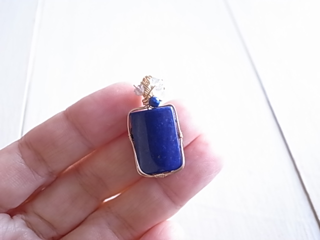 瑠璃色に輝くラピスラズリ、ペンダントトップです。珍しいスクエアのラピスラズリに、飾りを付けて華やかにしてみました。夜空に煌く星のようで、とても神秘的なストーンです。